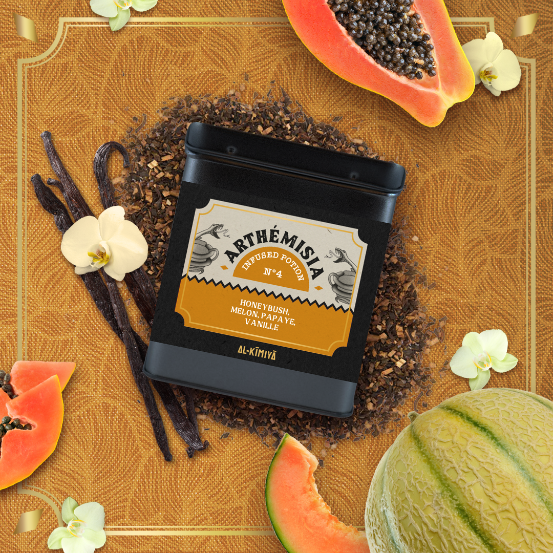 L’Arthémisia 4, s’inspire de la recette du « Monde ». L’ honeybush révèle une saveur de miel sucré caractéristique, puis l’association du melon et de la papaye saura vous étonner.